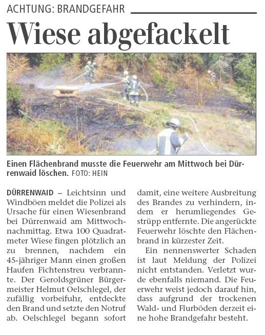 Die Gemeindlichen Feuerwehren (Dürrenwaid, Geroldsgrün, Langenbach und Steinbach) wurden um 16:01 Uhr zu einem Flächenbrand in Dürrenwaid gerufen.