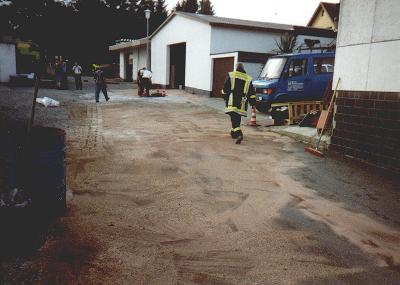 Ölunfall in einem HandwerksbetriebAlarmzeit: 01.08.2002 17:44 UhrEs sind ca 500 Liter ausgelaufener Dieselkraftstoff zu binden und anschließend der Abwasserkanale zu spülen.