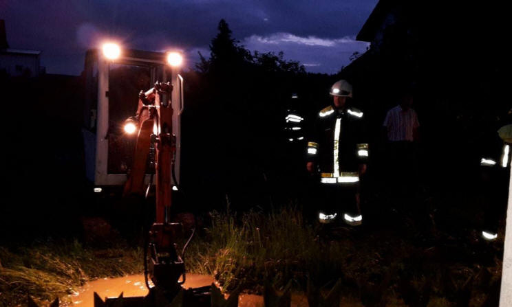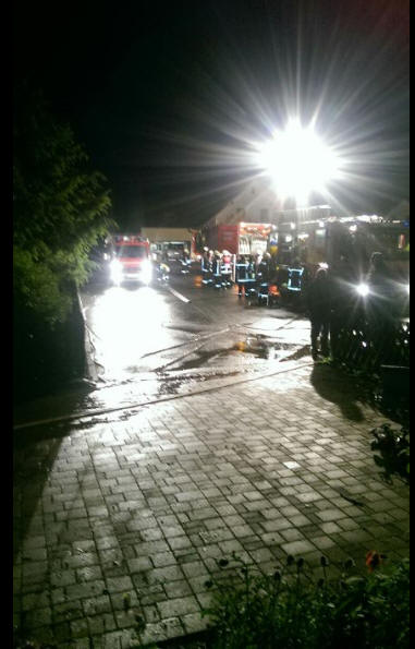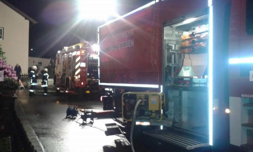 Unterstützung angefordert. Im weiteren Verlauf musste Wasser mit der TS8 und einem Schwimmsauger vor der Gartenmauer des benachbarten Wohnhauses weggepumpt werden um dieses Wohnhaus vor einem Wasserschaden zu schützen. Nachdem die Gefahr durch nachfließendes Wasser beseitigt wurde, konnte der Keller des Anwesens leer gepumpt werden. Während dieser Arbeiten kamen weitere Probleme mit geringen Mengen Gefahrstoffen zum tragen. In den Räumen gelagerter Kalk und Düngemittel reagierten mit dem Wasser und machten wegen der austretenden Dämpfe sogar den Einsatz von Atemschutzgeräten erforderlich. Während des laufenden Einsatzes kam eine weitere Meldung "Keller unter Wasser" in der oberen Dorfstr. die es nebenbei zu bewältigen galt.