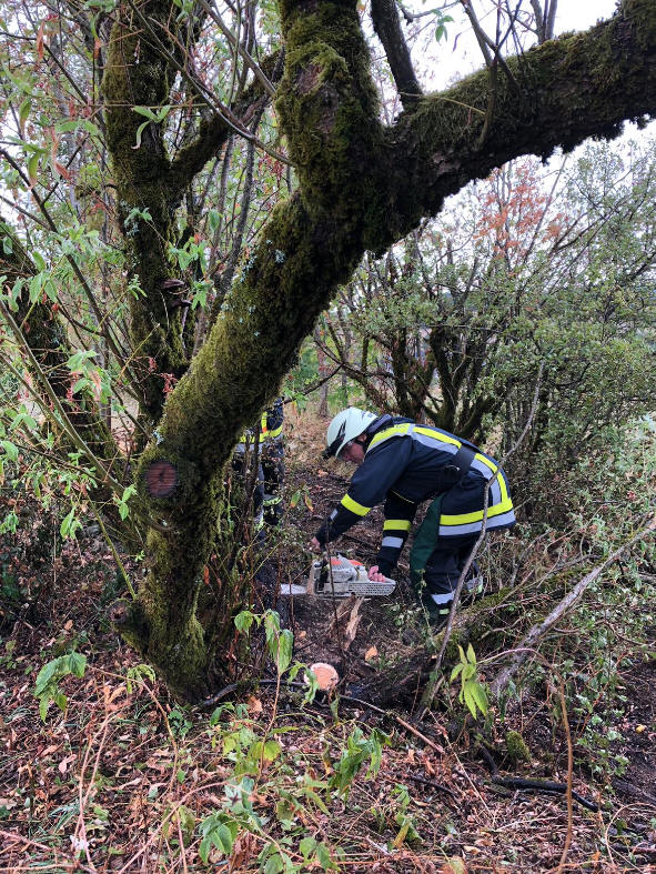 mit Hilfe einer Kettensäge entfernt und im Inneren gelöscht.
