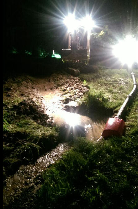 Unterstützung angefordert. Im weiteren Verlauf musste Wasser mit der TS8 und einem Schwimmsauger vor der Gartenmauer des benachbarten Wohnhauses weggepumpt werden um dieses Wohnhaus vor einem Wasserschaden zu schützen. Nachdem die Gefahr durch nachfließendes Wasser beseitigt wurde, konnte der Keller des Anwesens leer gepumpt werden. Während dieser Arbeiten kamen weitere Probleme mit geringen Mengen Gefahrstoffen zum tragen. In den Räumen gelagerter Kalk und Düngemittel reagierten mit dem Wasser und machten wegen der austretenden Dämpfe sogar den Einsatz von Atemschutzgeräten erforderlich. Während des laufenden Einsatzes kam eine weitere Meldung "Keller unter Wasser" in der oberen Dorfstr. die es nebenbei zu bewältigen galt.