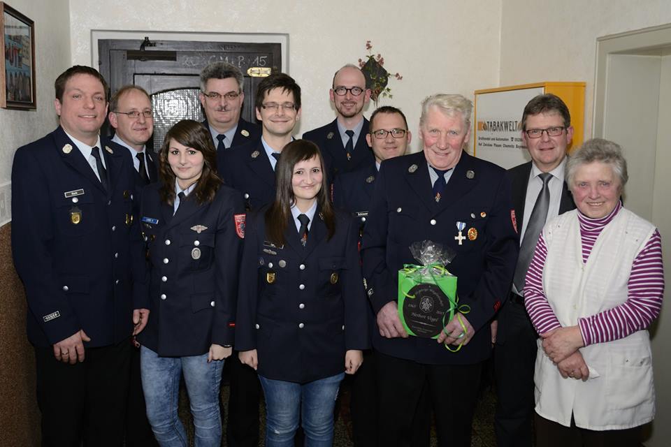 v.l.: Vorsitzender Matthias Rank, KBM Michael Horn, Oberfeuerwehrfrau Vanessa Lang, Kommandant Hans-Jürgen Lang, Florian Engelhardt (20 Jahre aktiver Dienst), Nathalie Lang (Truppmann Teil 2), Thomas Färber (20 Jahre), Stefan Schiewer (20 Jahre), Herbert Vogel (50 Jahre Mitglied im Feuerwehrverein), Bürgermeister Helmut Oelschlegel und Hilde Oelschlegel (Verdienstmedaille der FFW Steinbach).